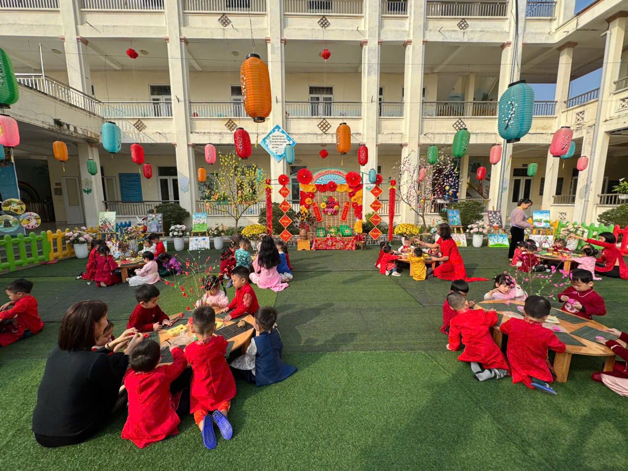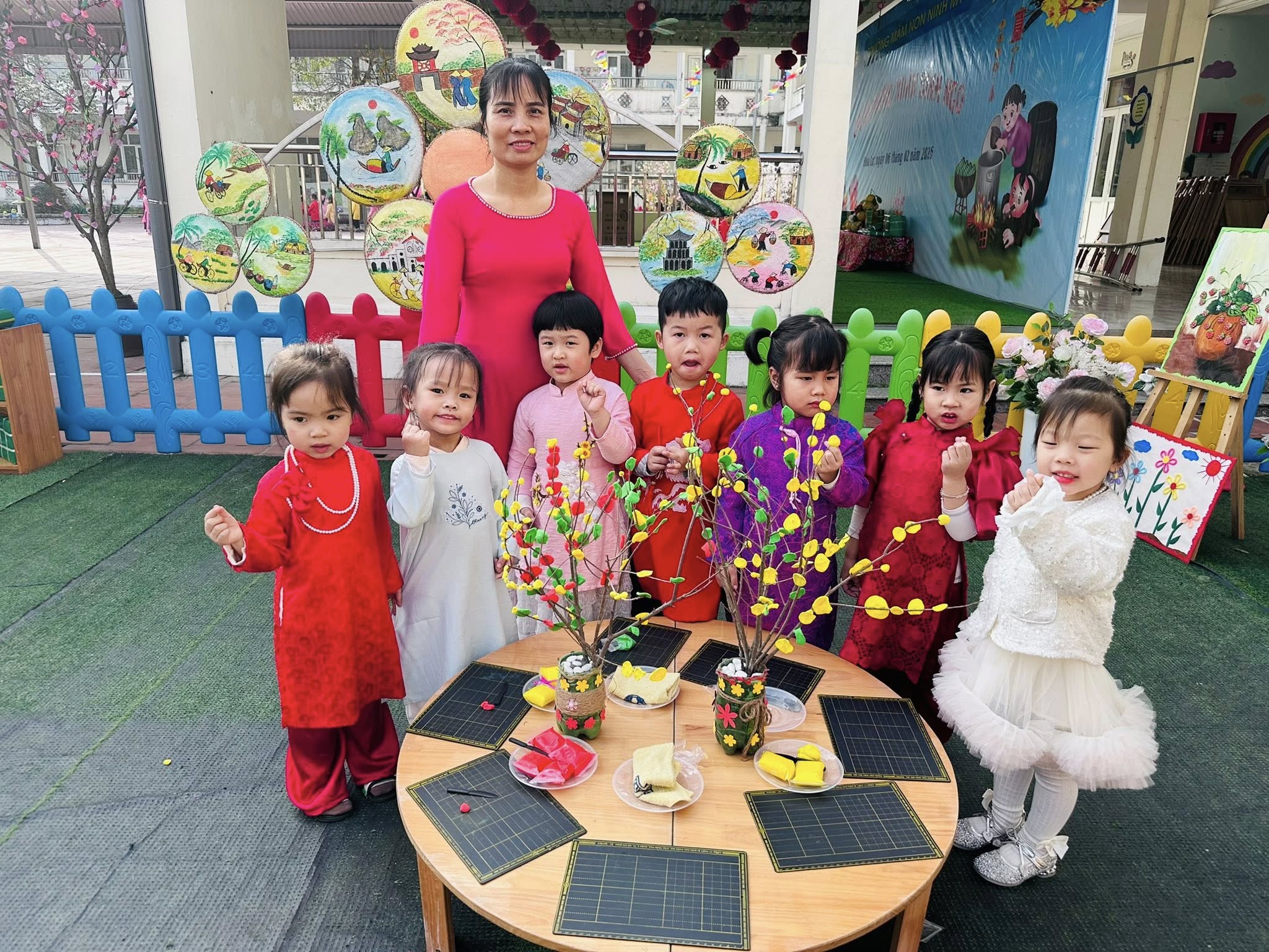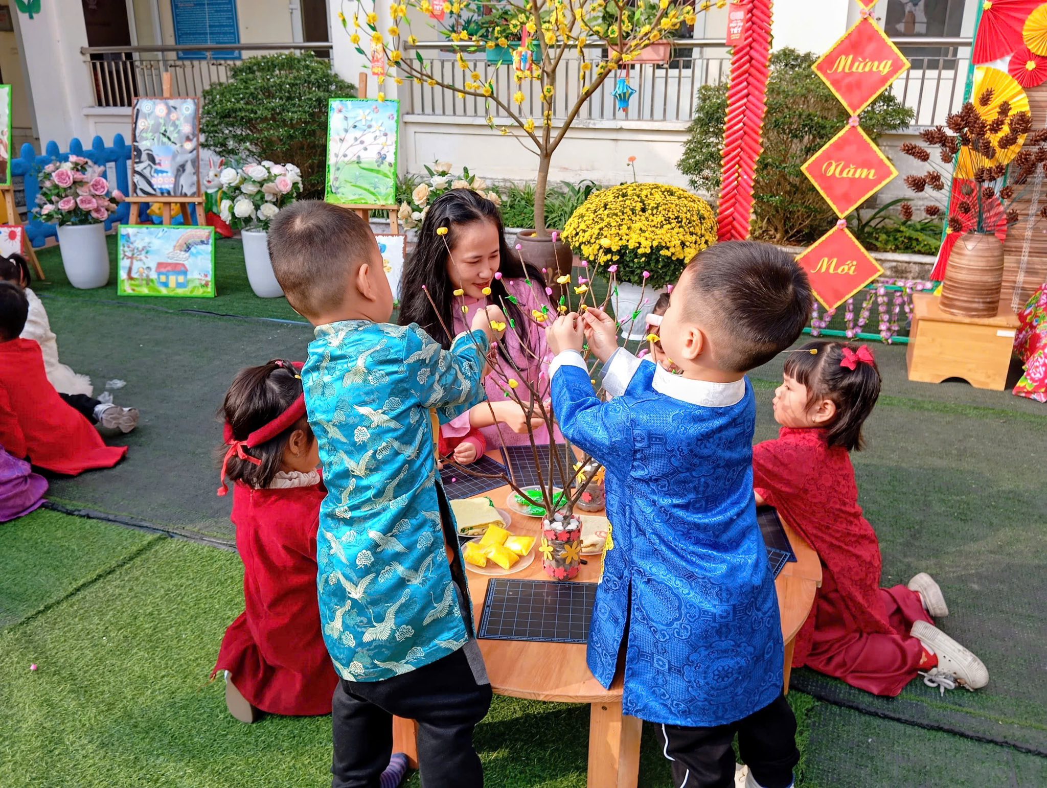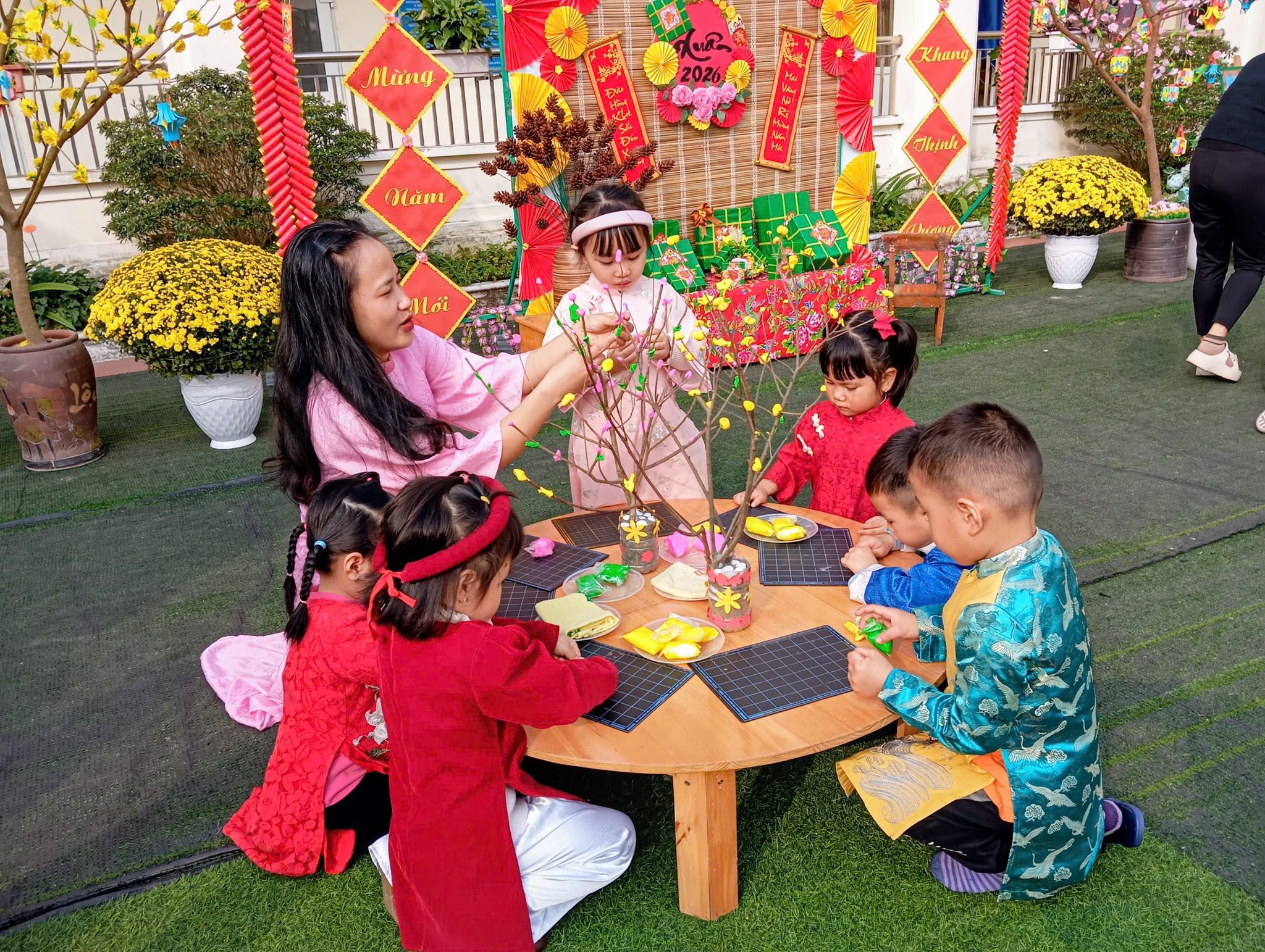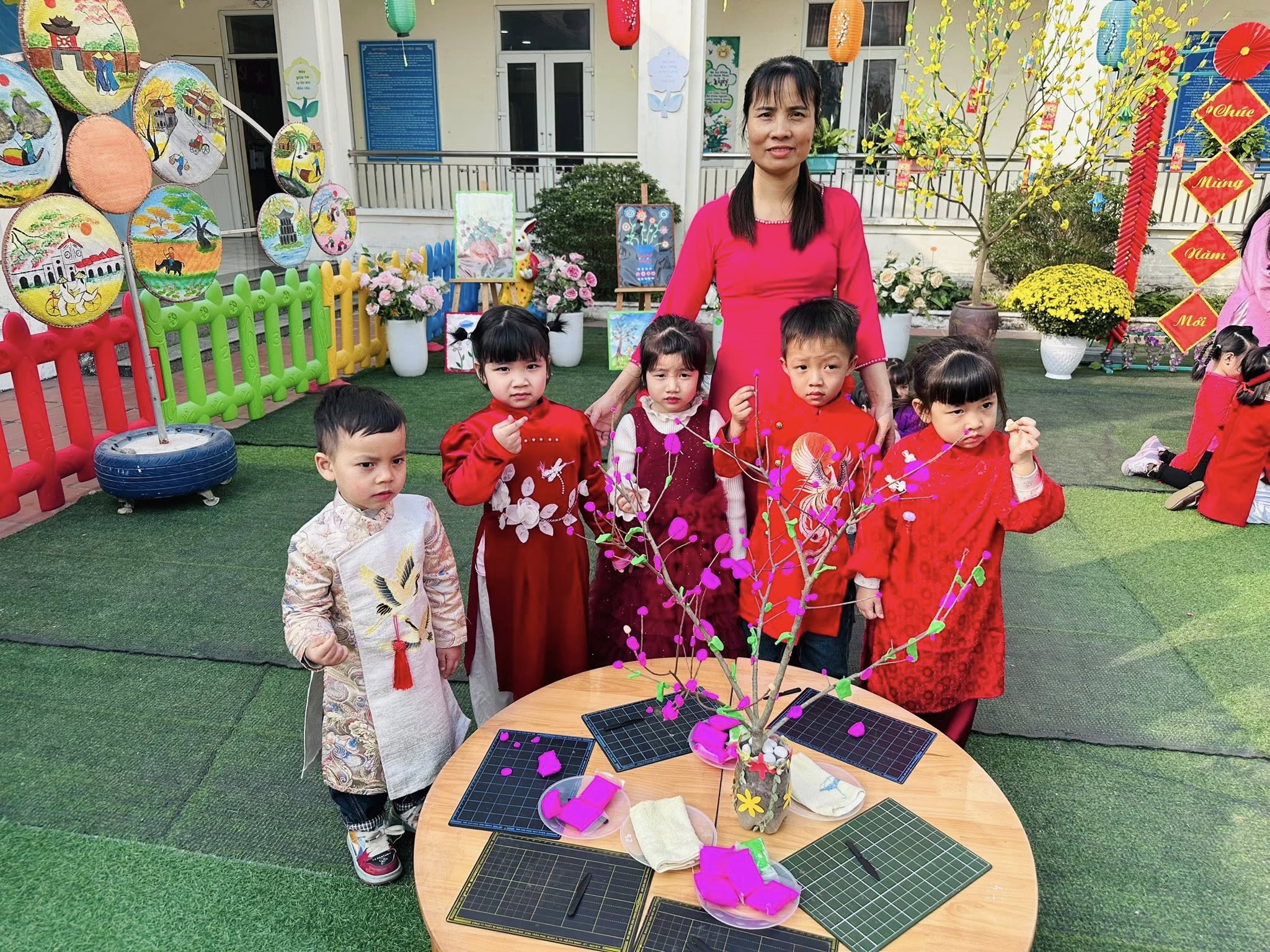Những cây đào hồng đỏ, cây mai sắc vàng, những chiếc pháo hoa, đèn lồng, câu đối rực rỡ sắc màu là món đồ trang trí trong ngày tết, mang đến cho trẻ không khí tươi vui của những ngày đầu xuân mới.
