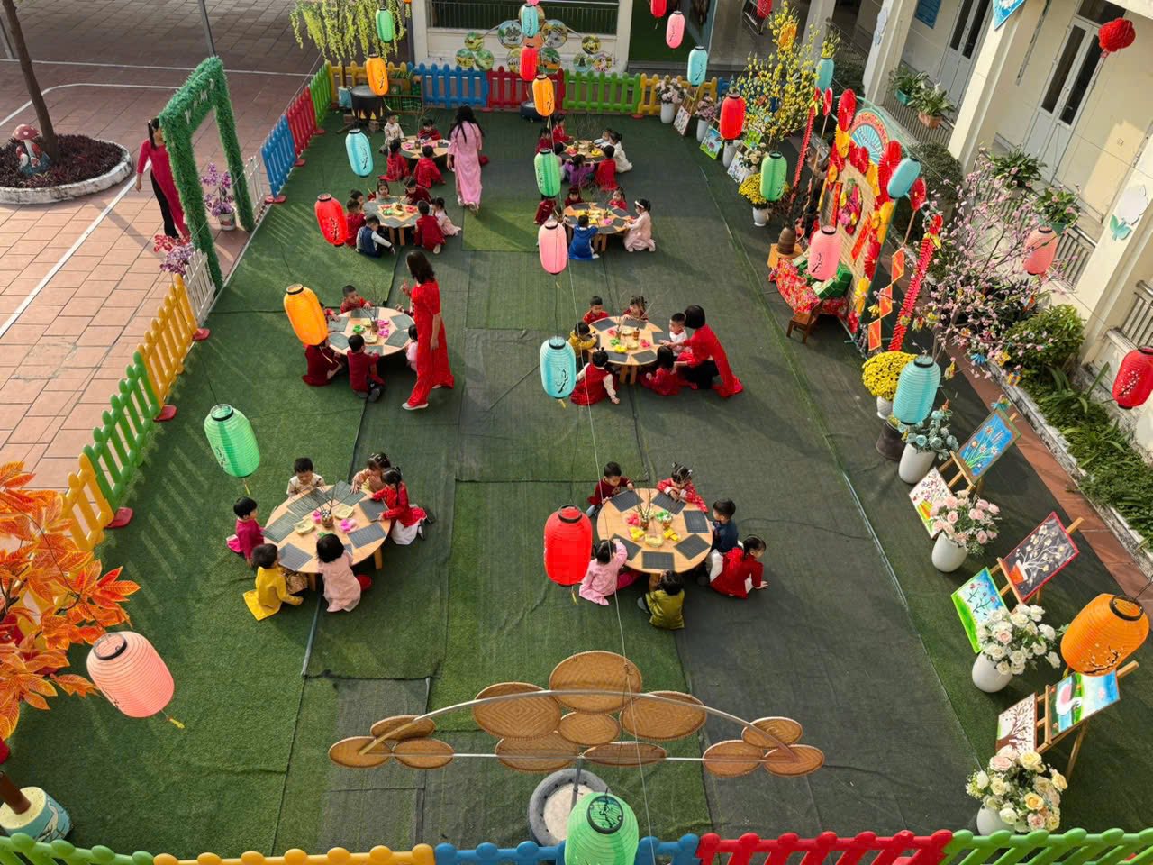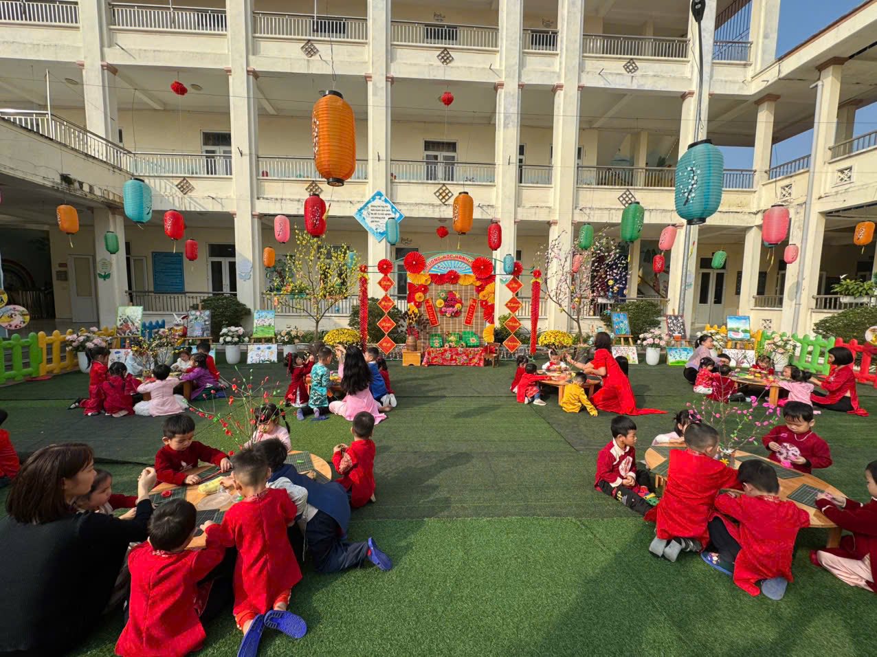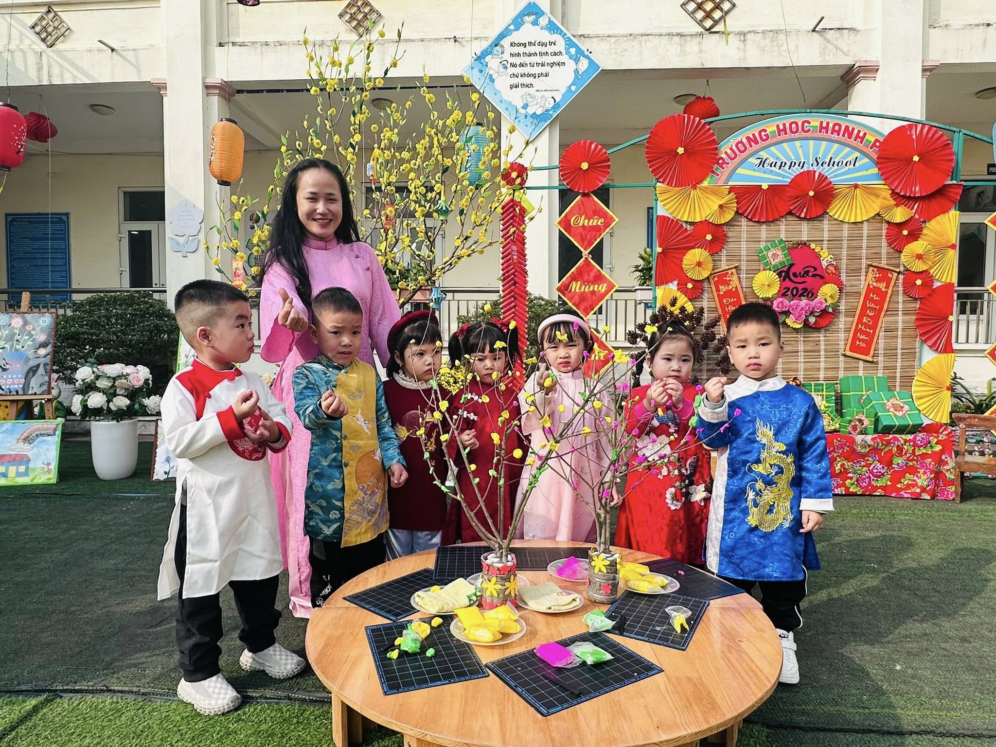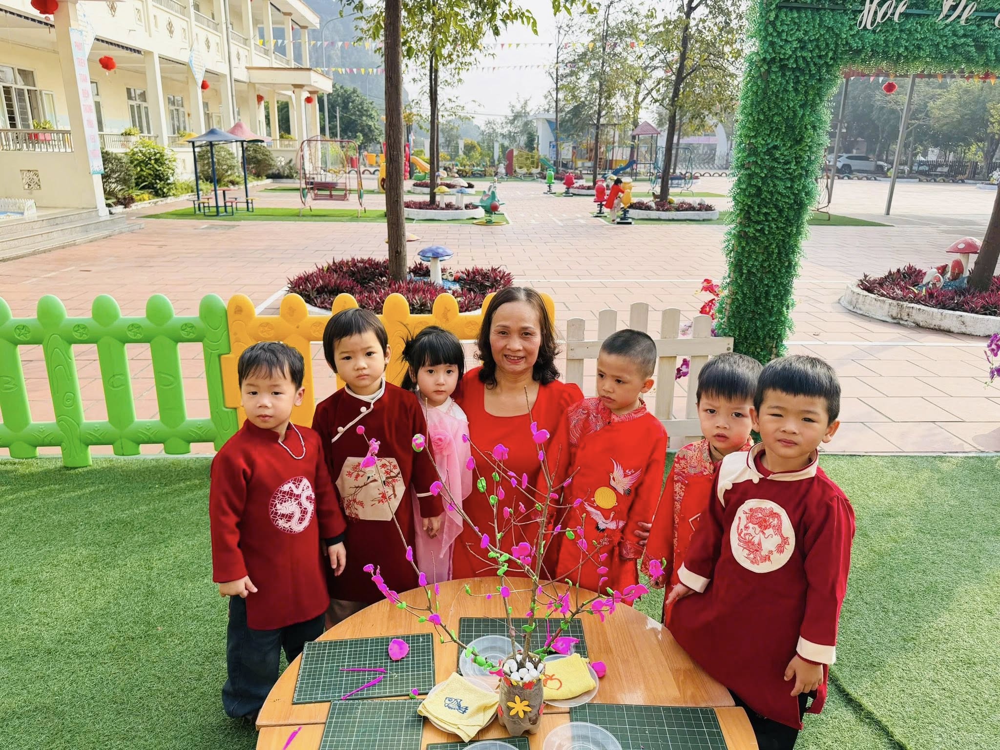 Những cây đào hồng đỏ, cây mai sắc vàng, những chiếc pháo hoa, đèn lồng, câu đối rực rỡ sắc màu là món đồ trang trí trong ngày tết, mang đến cho trẻ không khí tươi vui của những ngày đầu xuân mới.