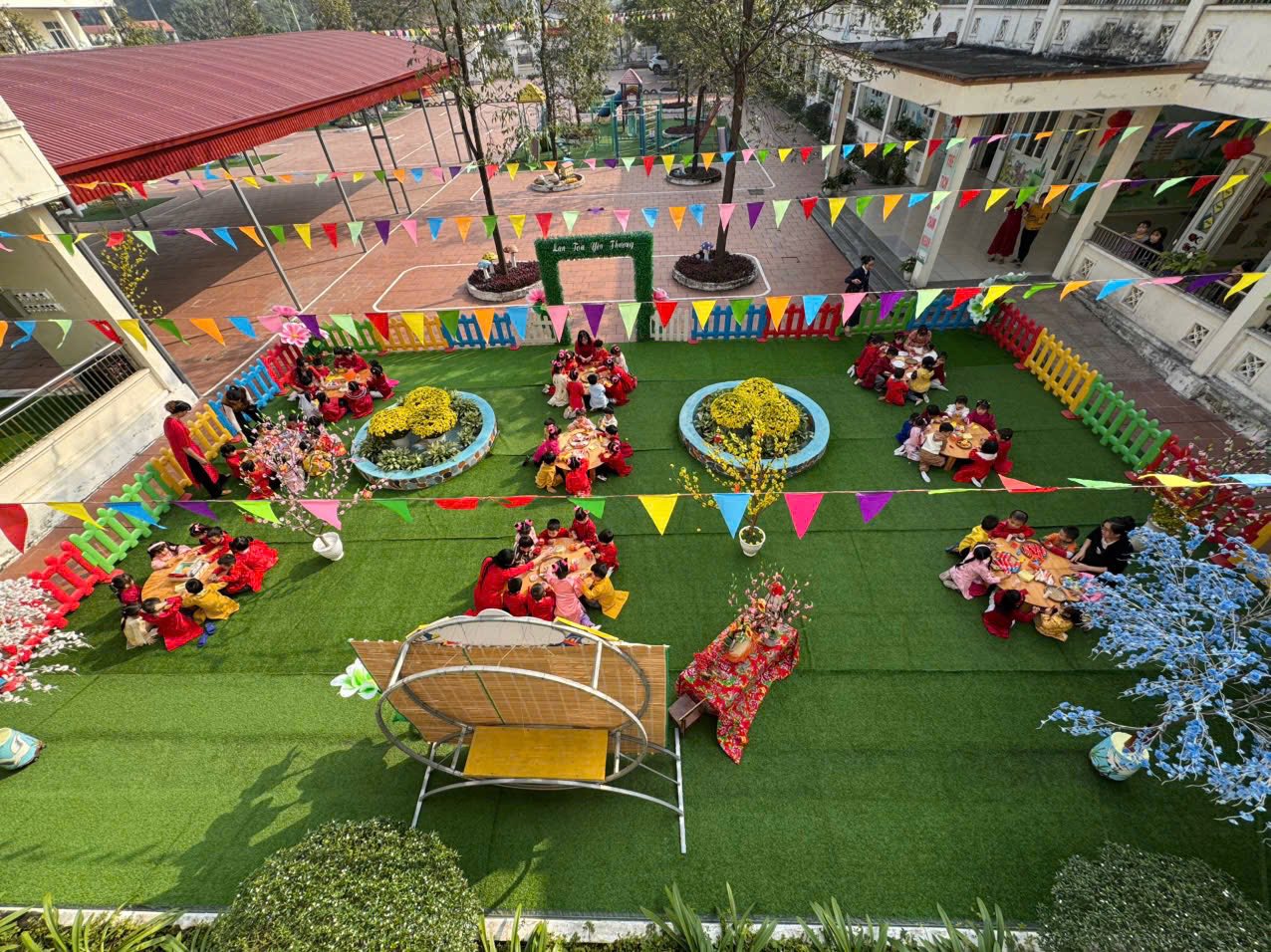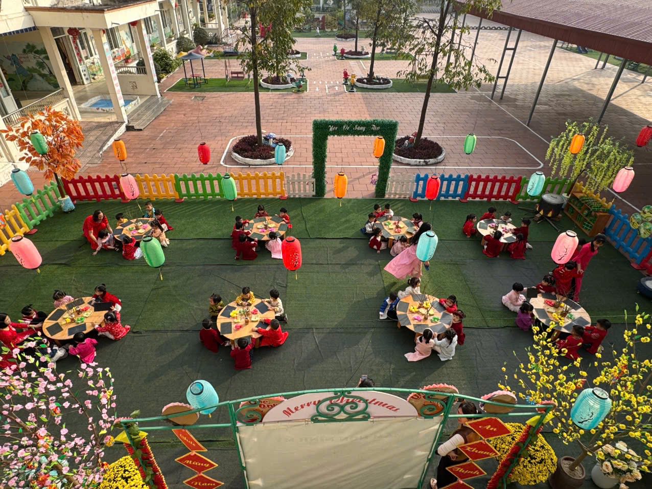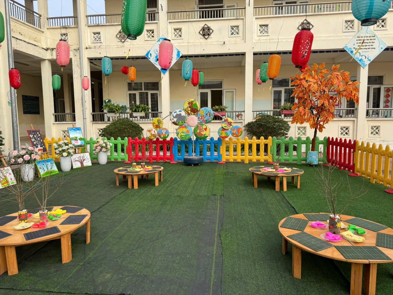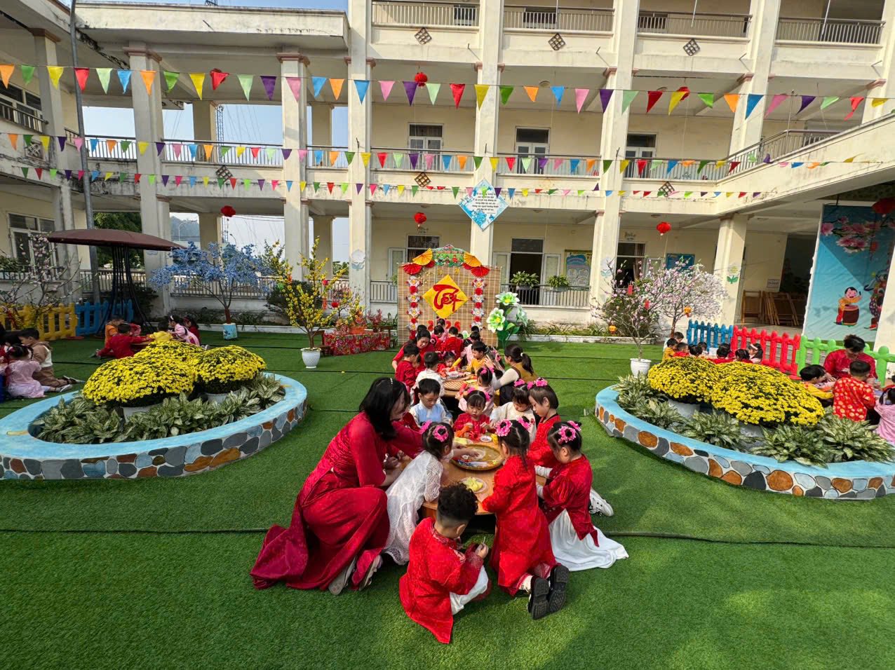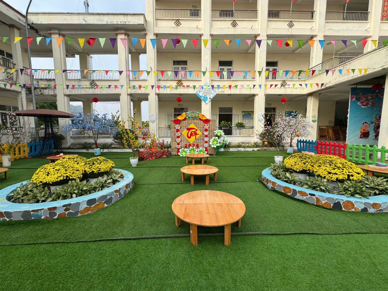 Những cây đào hồng đỏ, cây mai sắc vàng, những chiếc pháo hoa, đèn lồng, câu đối rực rỡ sắc màu là món đồ trang trí trong ngày tết, mang đến cho trẻ không khí tươi vui của những ngày đầu xuân mới.