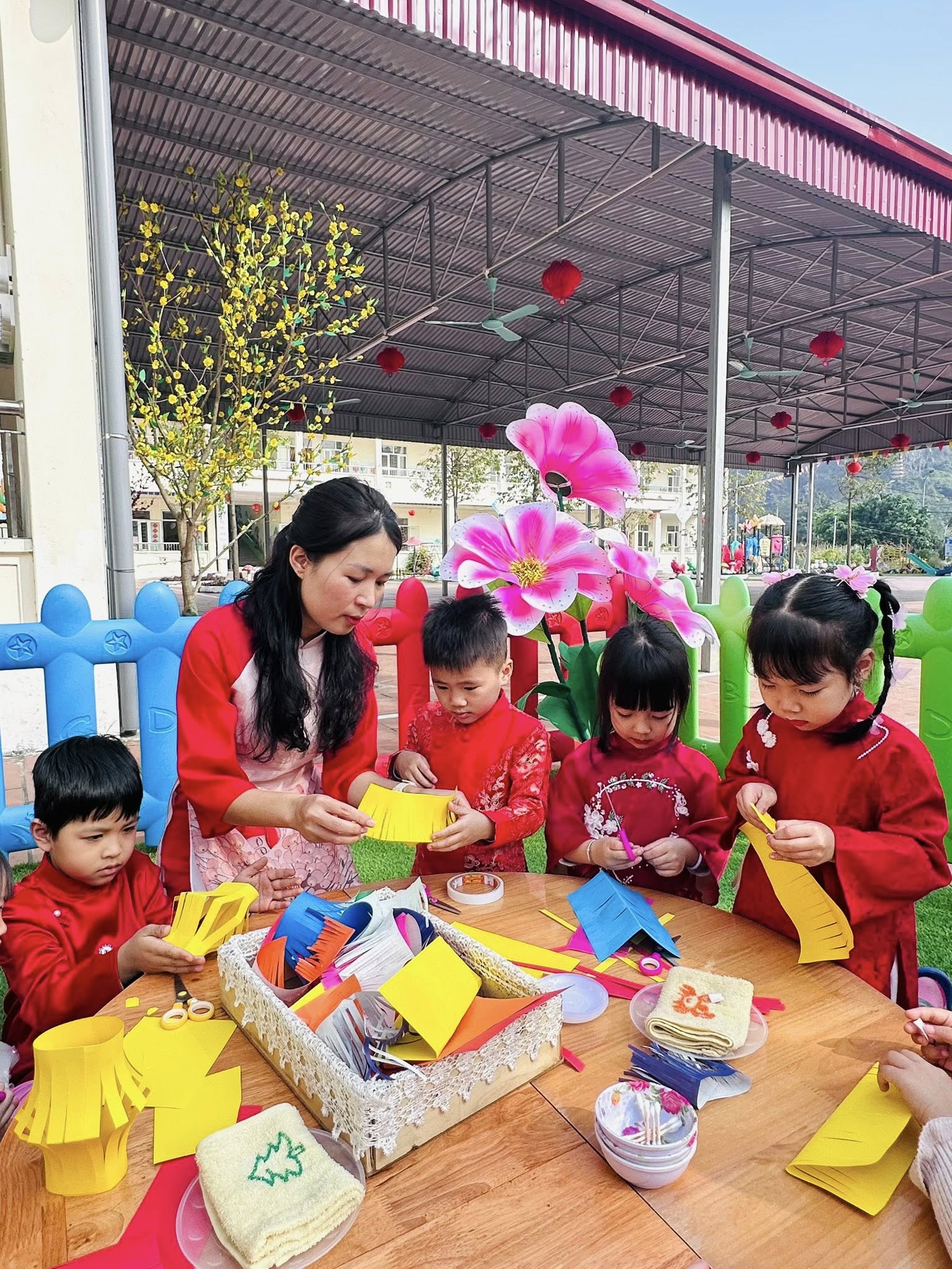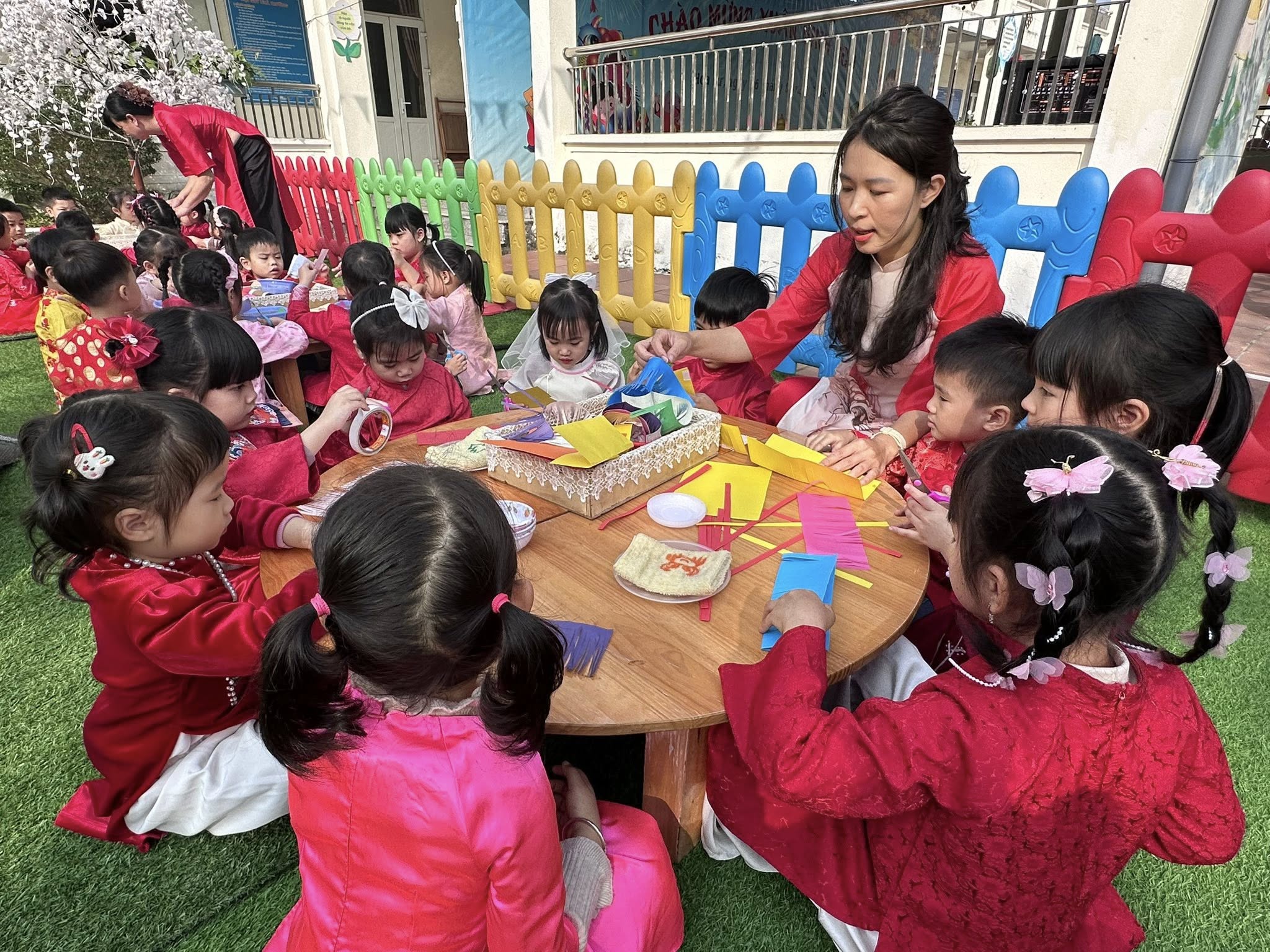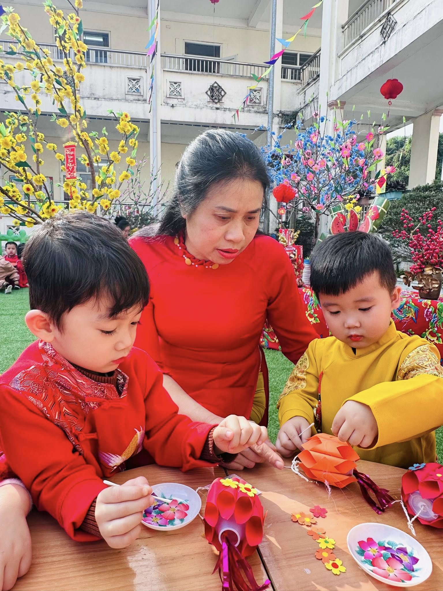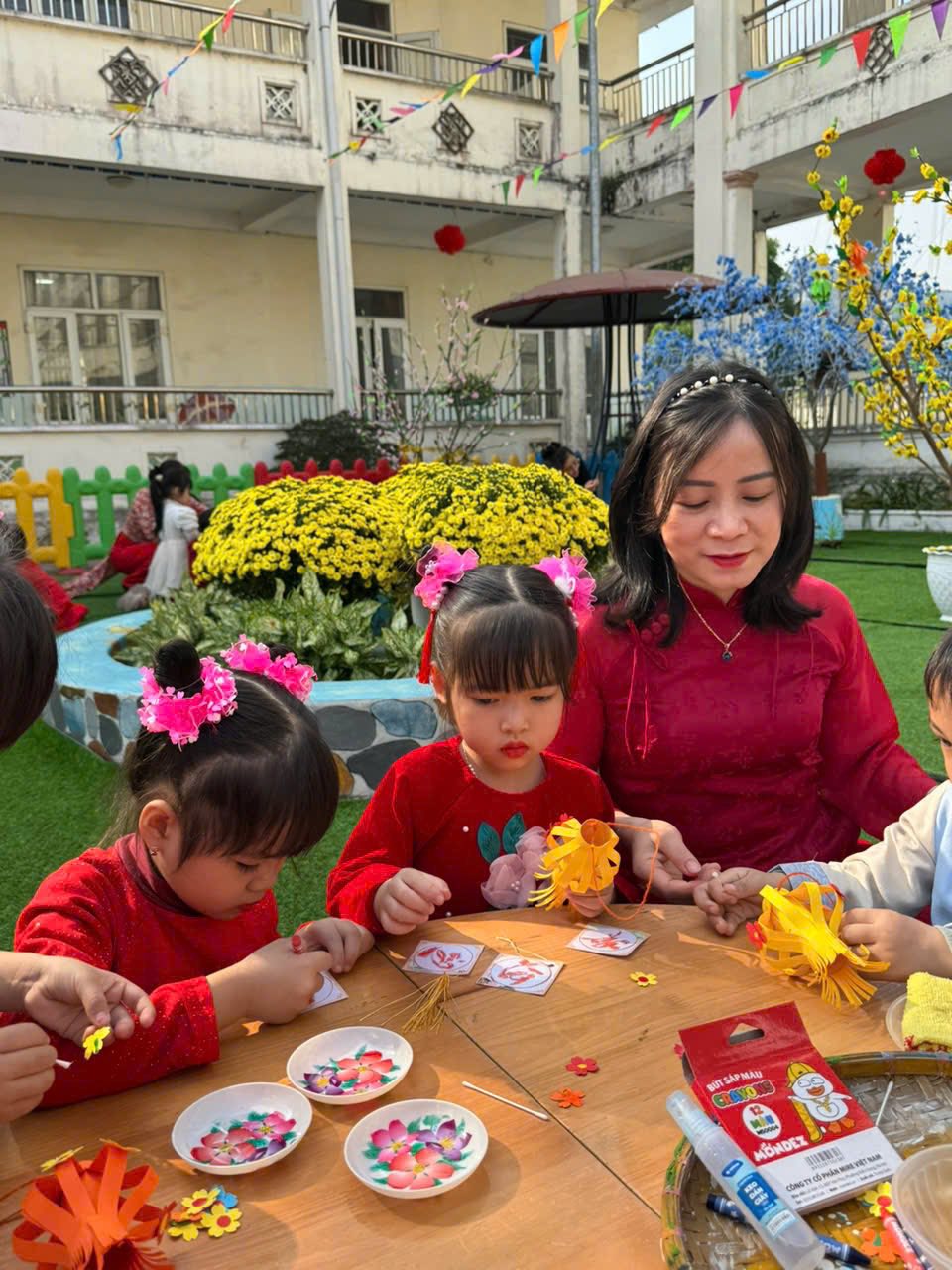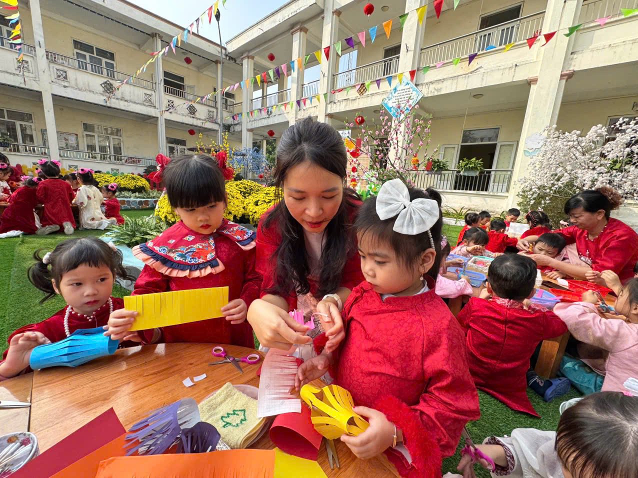 Còn các bạn nhỏ khối 4 tuổi đã cùng nhau làm pháo hoa, đèn lồng, câu đối để trang trí cây đào, cây mai với sự hào hứng và thích thú vô cùng. Từ những nguyên vật liệu đơn giản, an toàn như giấy màu, ống giấy…, dưới sự hướng dẫn của cô giáo, các bé đã khéo léo tạo nên những chiếc pháo hoa, đèn lồng rực rỡ sắc màu.