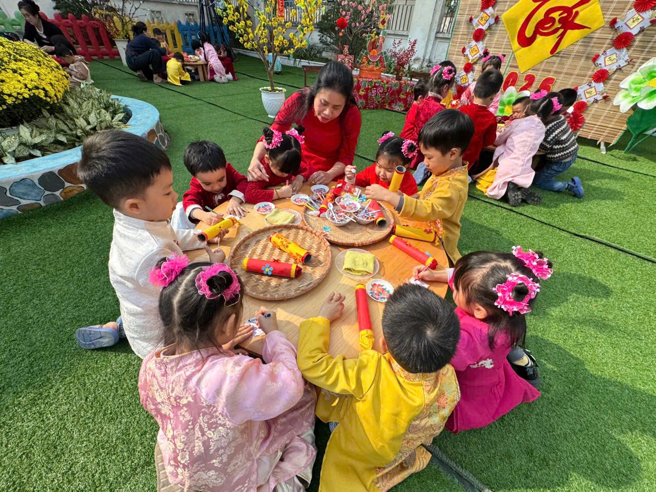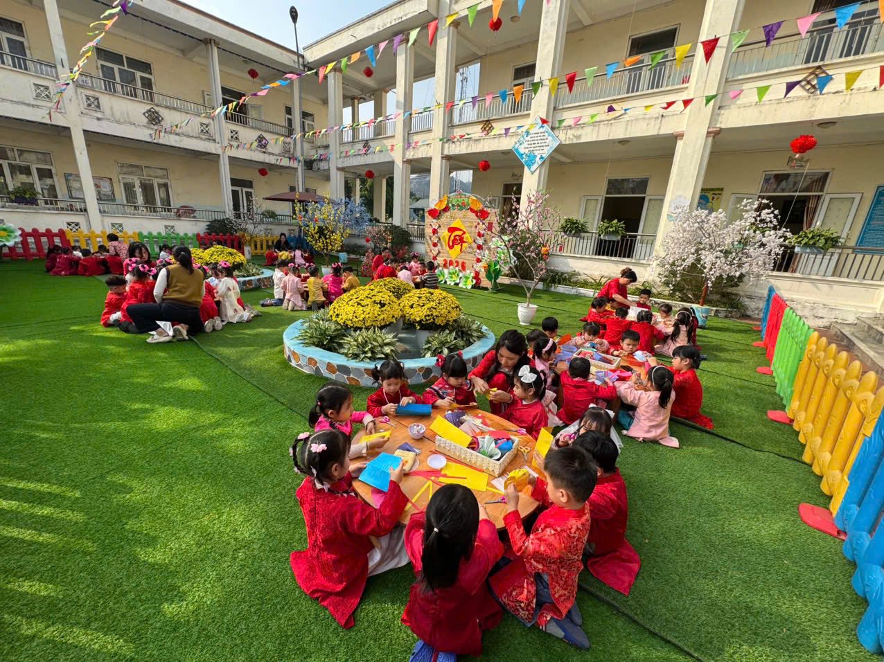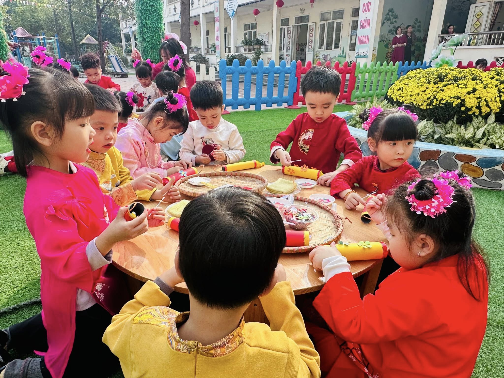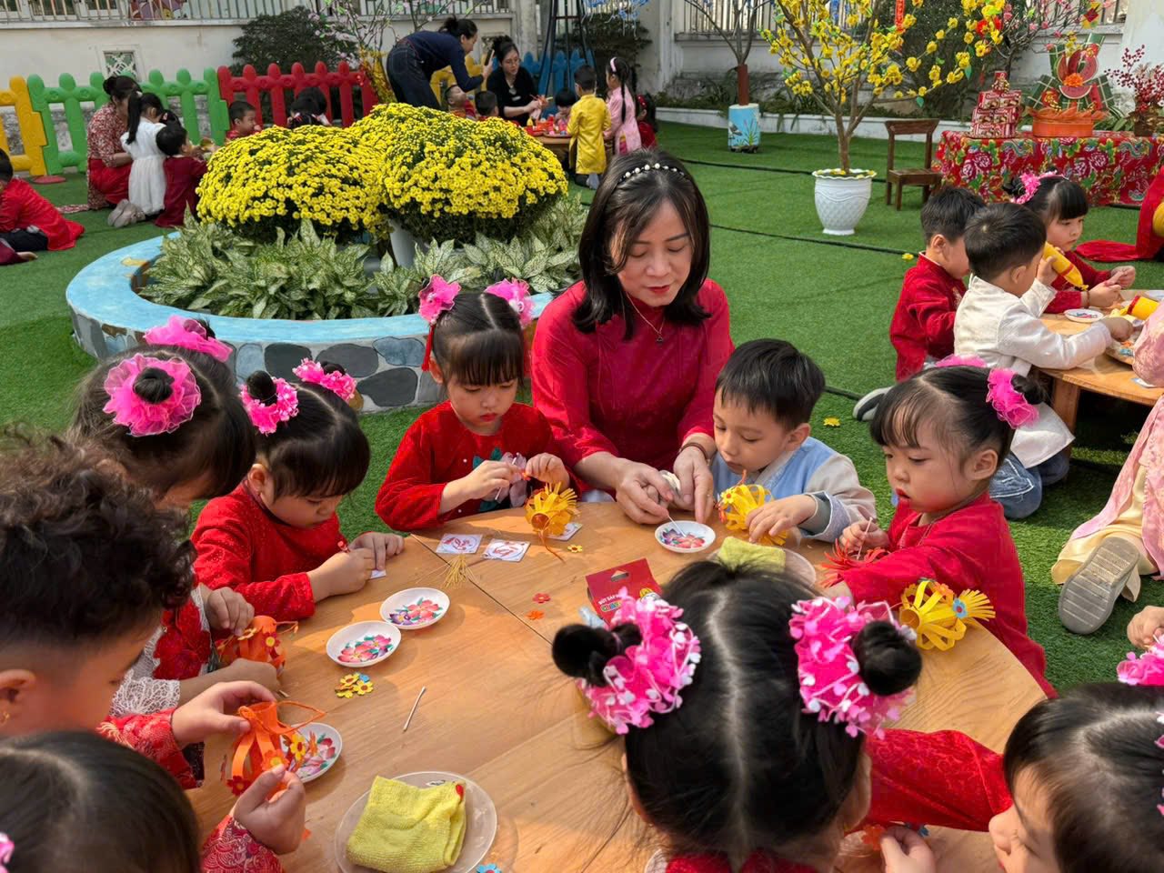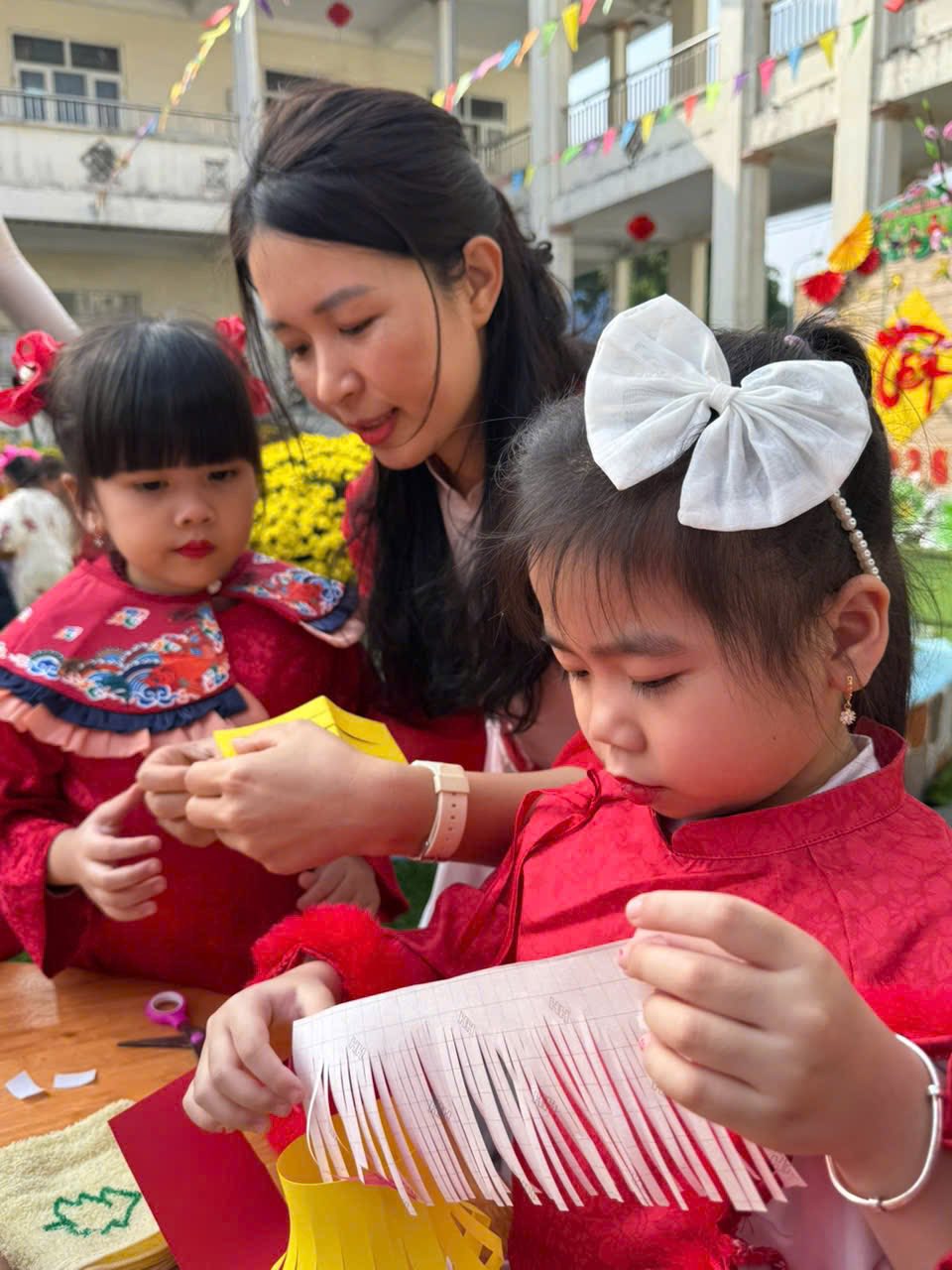 Còn các bạn nhỏ khối 4 tuổi đã cùng nhau làm pháo hoa, đèn lồng, câu đối để trang trí cây đào, cây mai với sự hào hứng và thích thú vô cùng. Từ những nguyên vật liệu đơn giản, an toàn như giấy màu, ống giấy…, dưới sự hướng dẫn của cô giáo, các bé đã khéo léo tạo nên những chiếc pháo hoa, đèn lồng rực rỡ sắc màu.