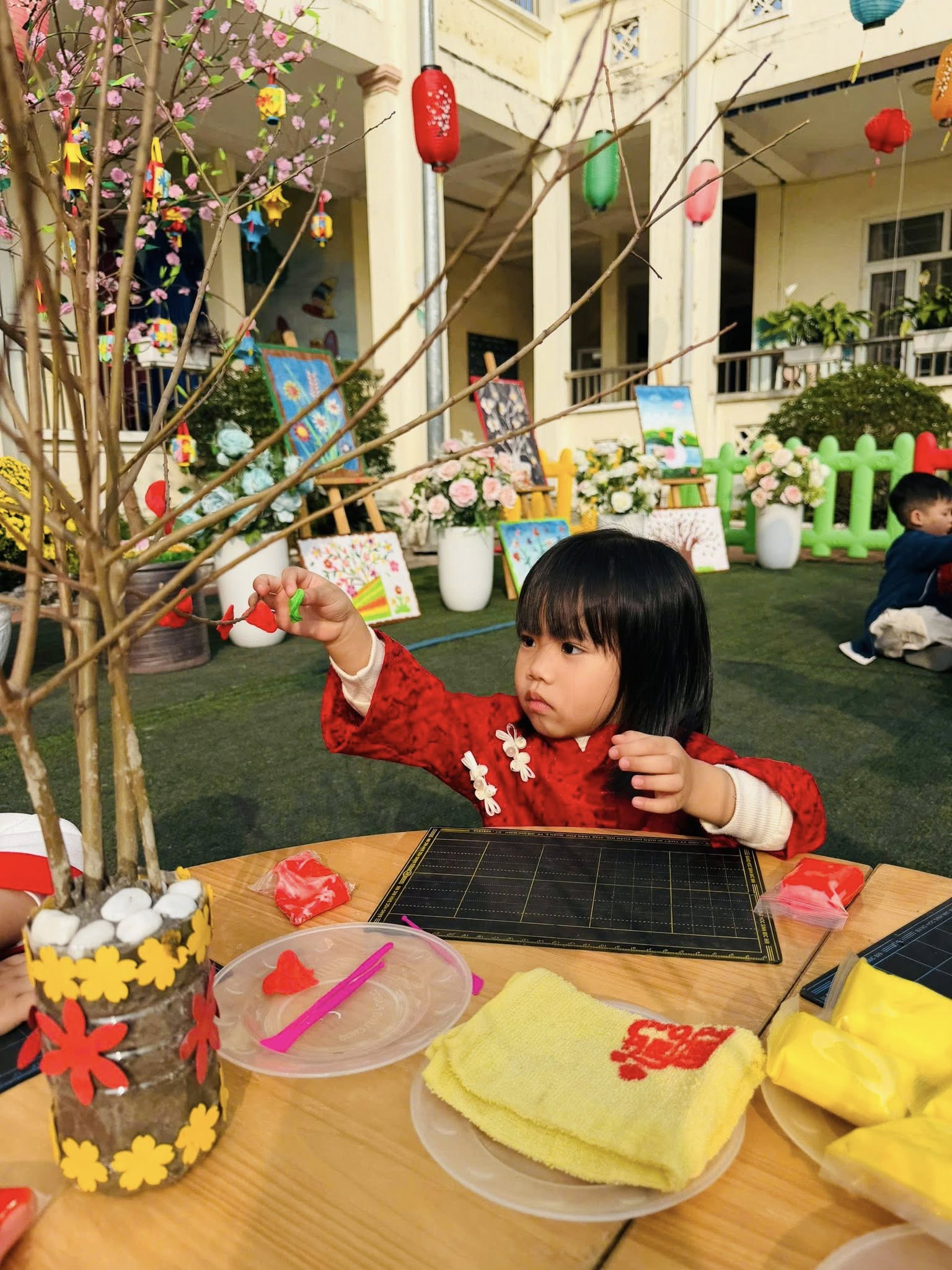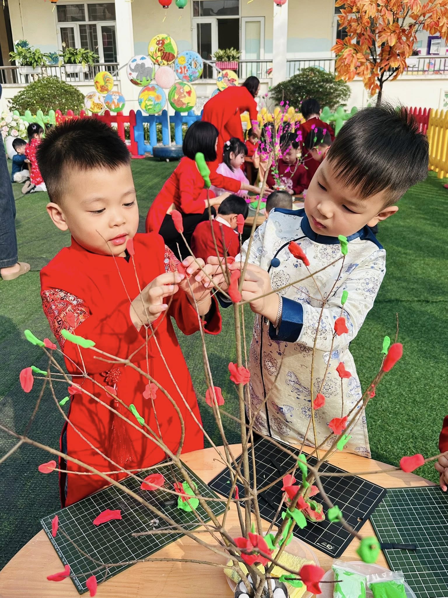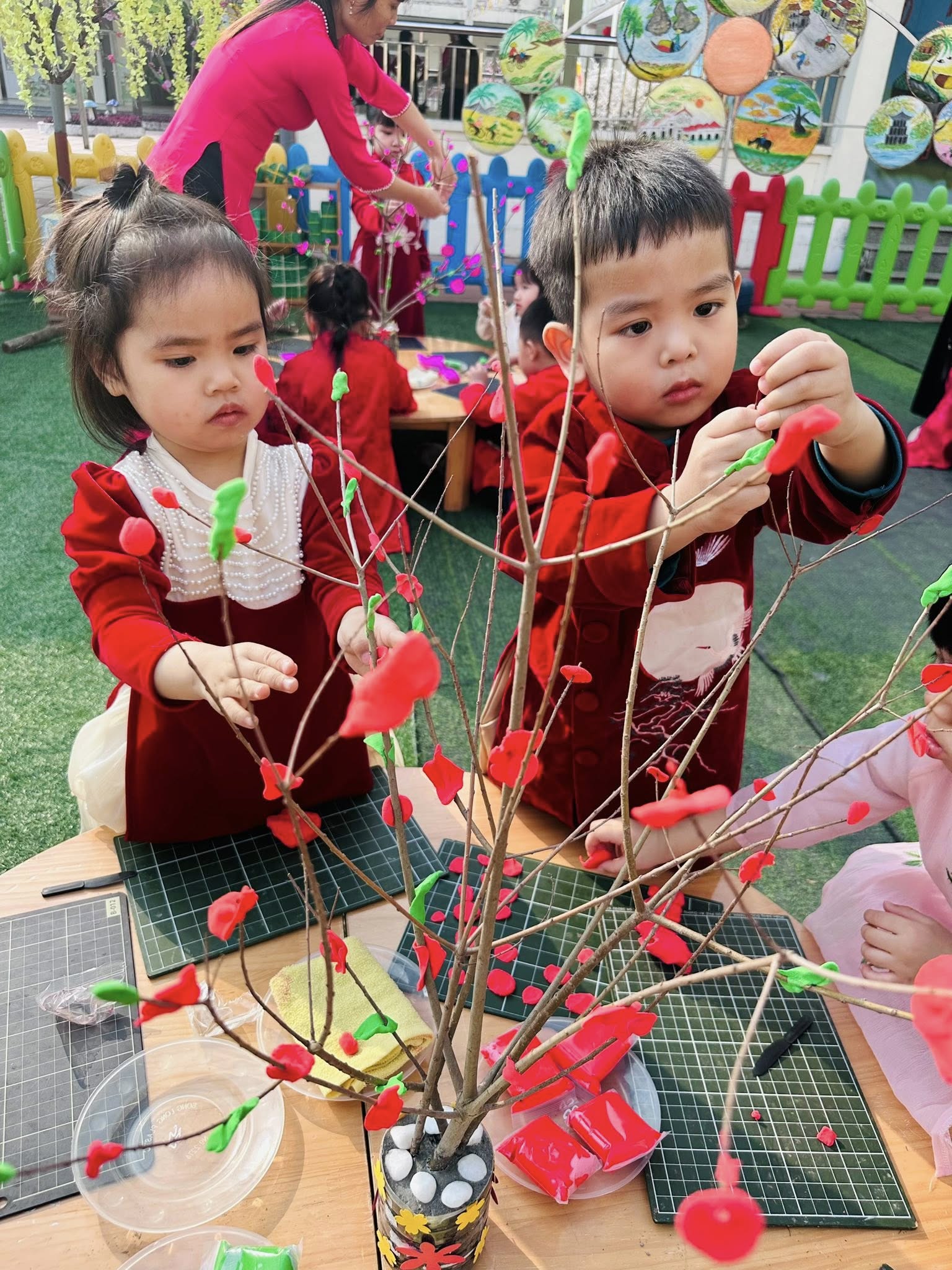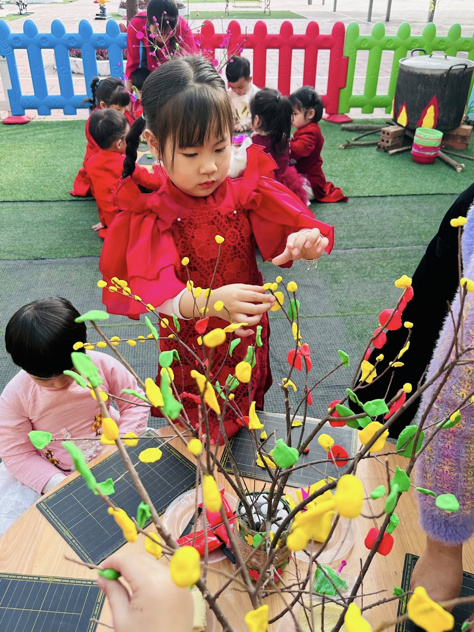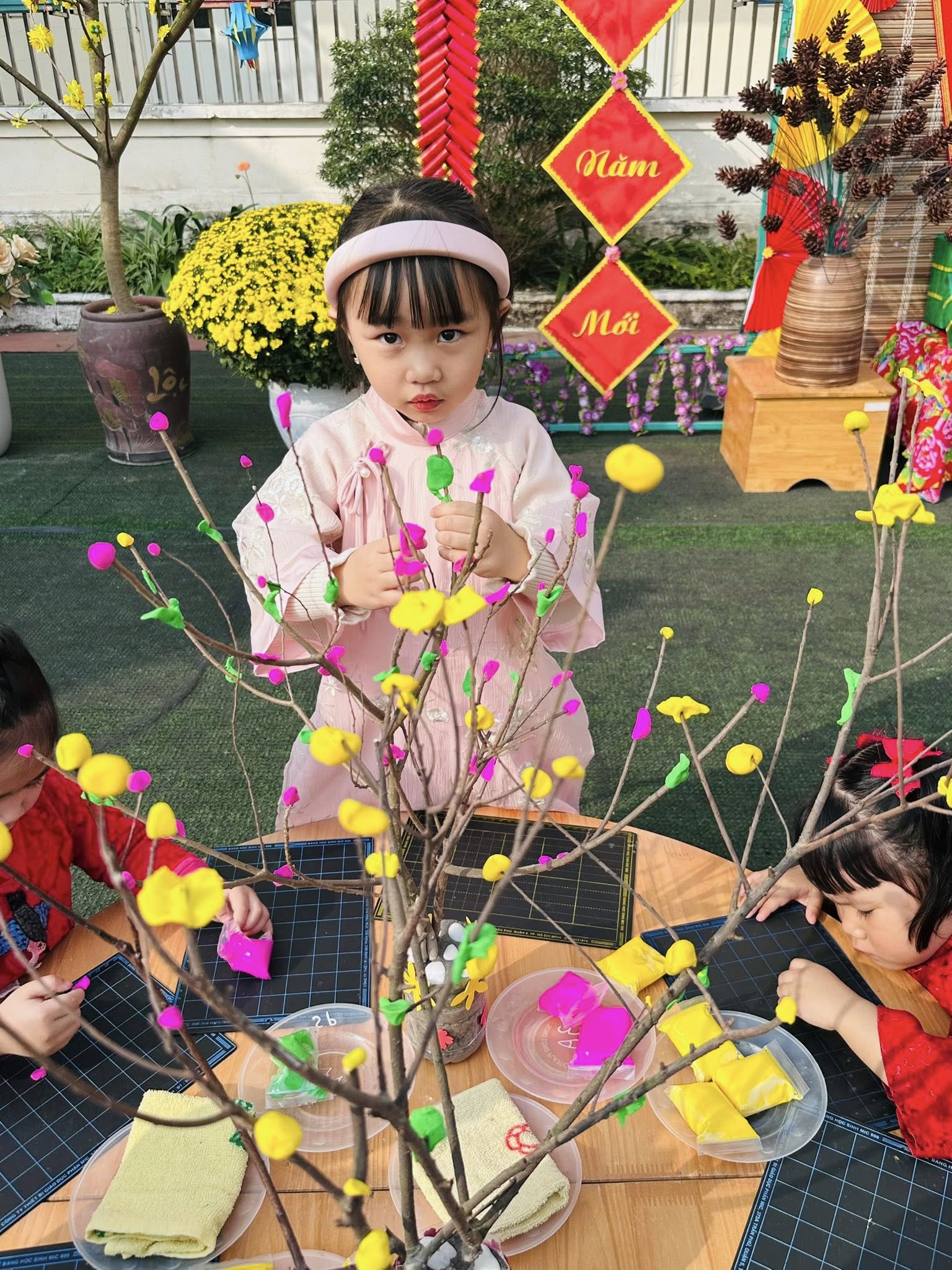 Từ những viên đất nặn đầy màu sắc, các bé khối 3 tuổi đã chọn màu hồng cho cánh hoa đào, màu vàng cho sắc hoa mai, và màu xanh mướt cho những chiếc lá non. Các bé đã khéo léo xoay tròn, ấn dẹt, vuốt dài,… tạo thành những bông hoa xinh xắn gắn lên cành cây khô, làm nên những cành đào, cành mai Tết rực rỡ, tràn đầy sắc xuân.