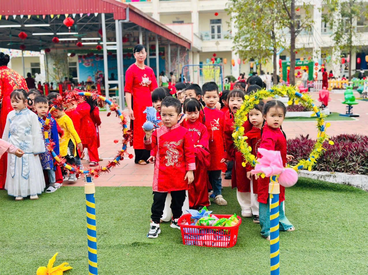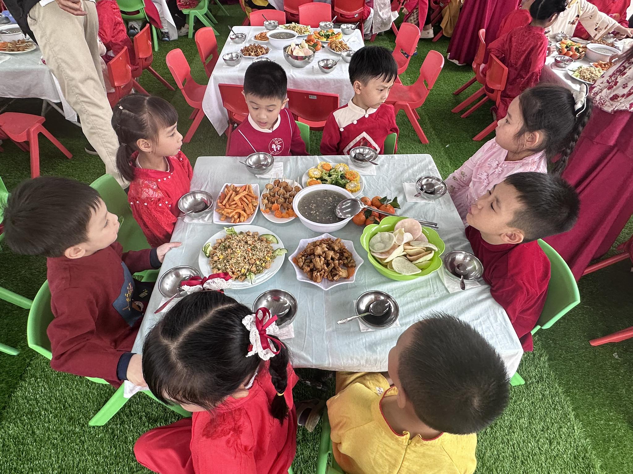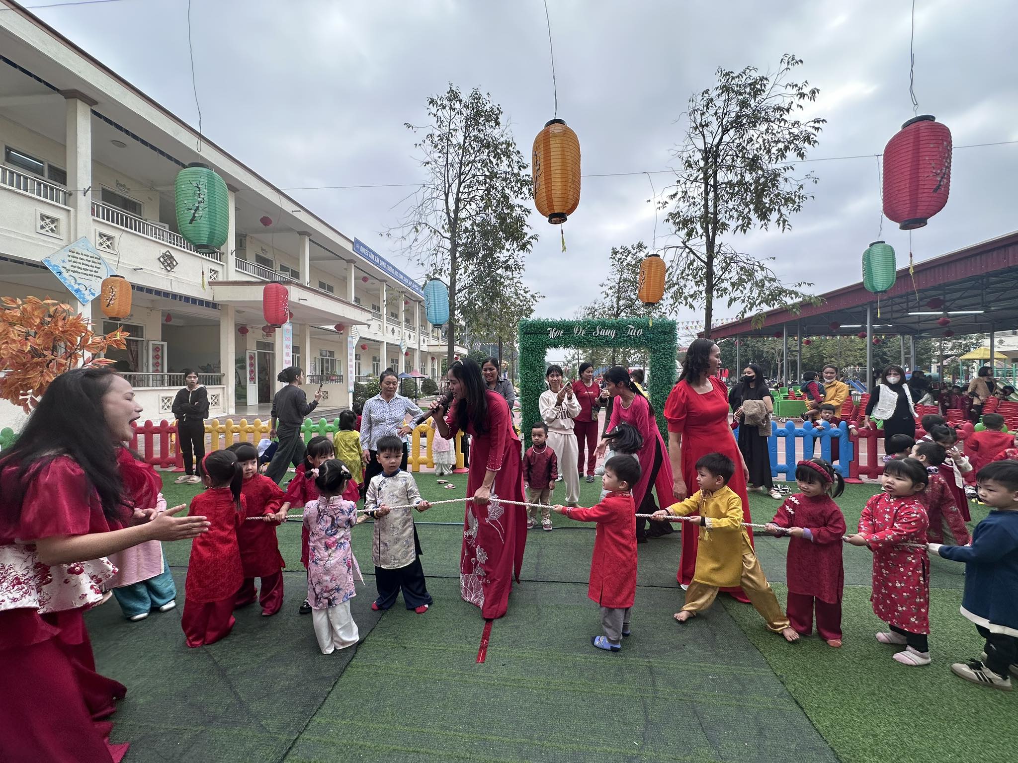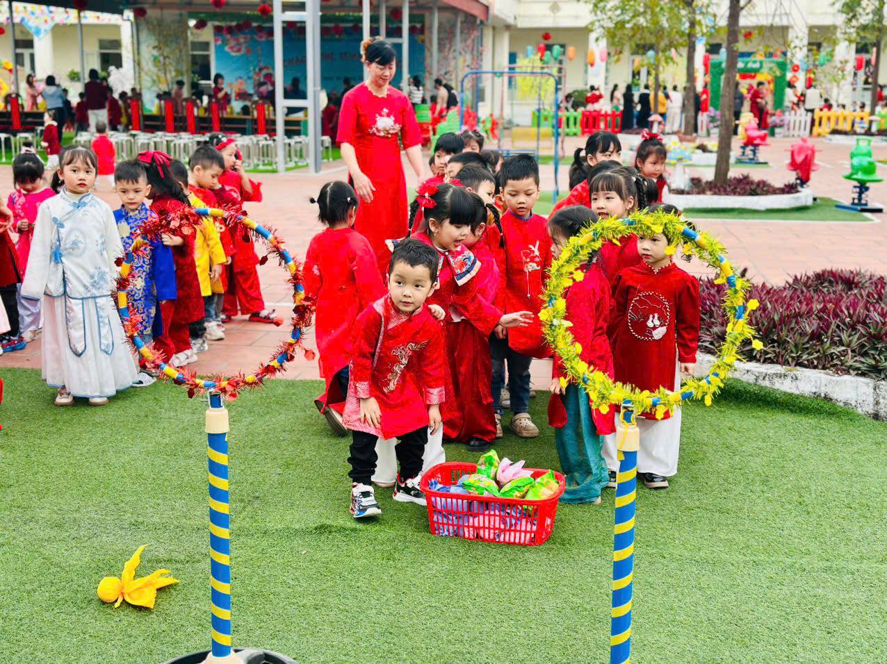 Không khí Tết rộn ràng lan tỏa qua những tiết mục múa hát đáng yêu, hoạt động giải đố vui nhộn, các trò chơi dân gian truyền thống và bữa tiệc buffet đầy sắc màu dành cho các bé.
