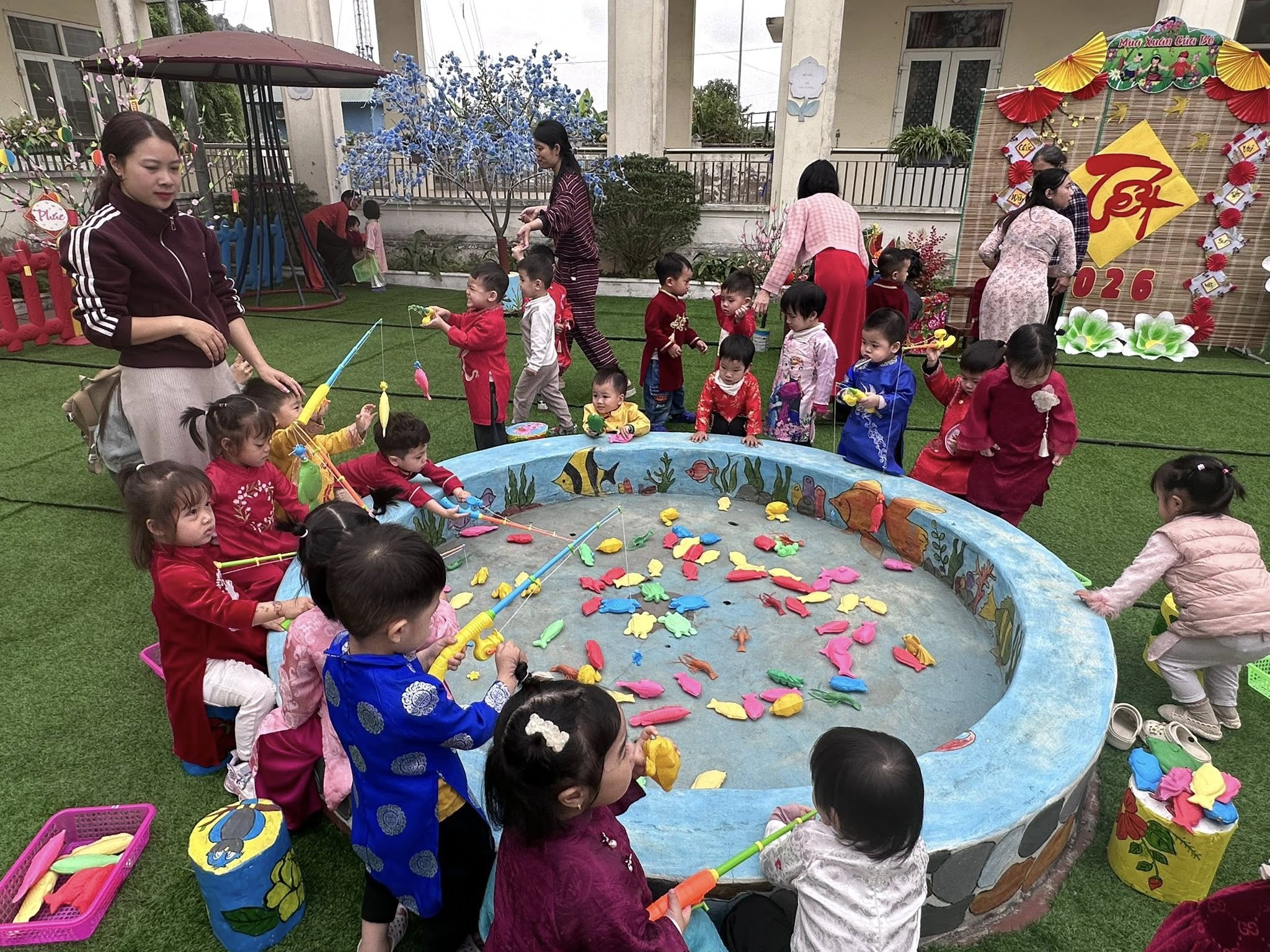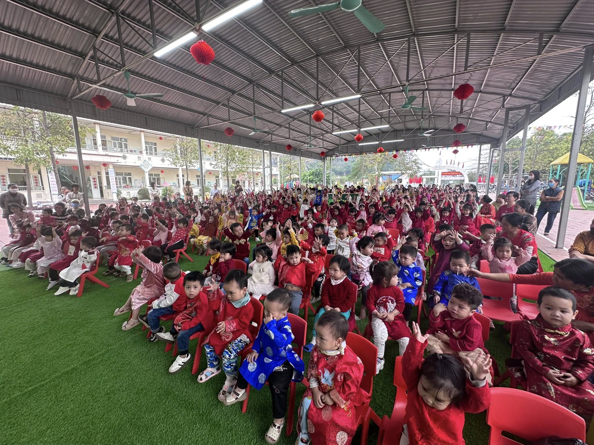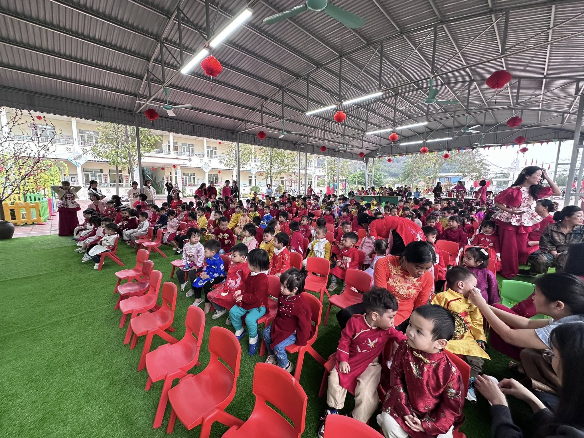Không khí Tết rộn ràng lan tỏa qua những tiết mục múa hát đáng yêu, hoạt động giải đố vui nhộn, các trò chơi dân gian truyền thống và bữa tiệc buffet đầy sắc màu dành cho các bé.
