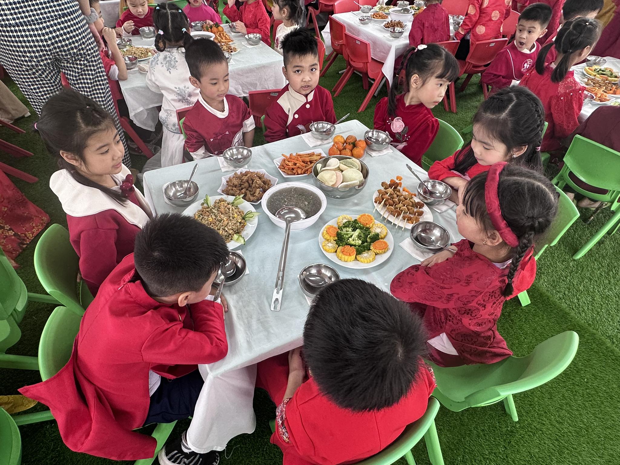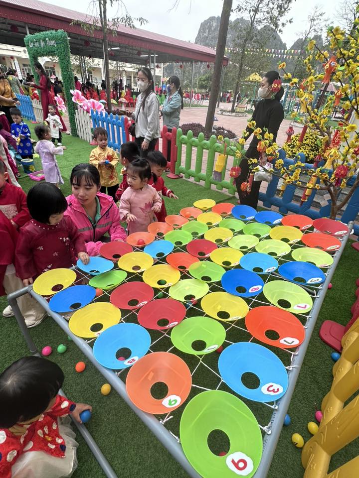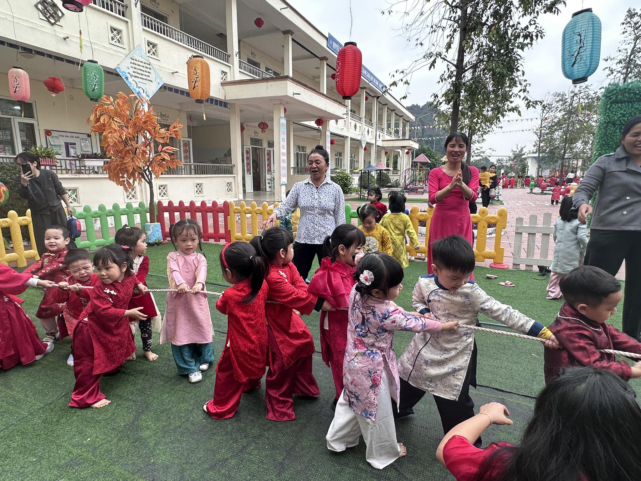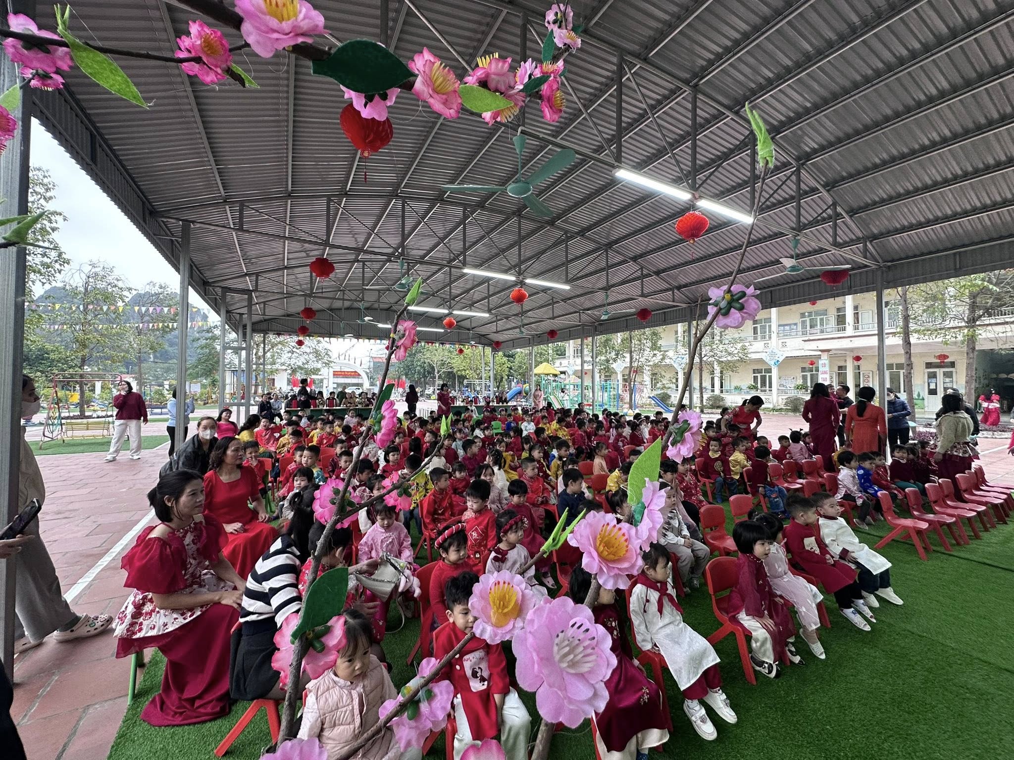Không khí Tết rộn ràng lan tỏa qua những tiết mục múa hát đáng yêu, hoạt động giải đố vui nhộn, các trò chơi dân gian truyền thống và bữa tiệc buffet đầy sắc màu dành cho các bé.