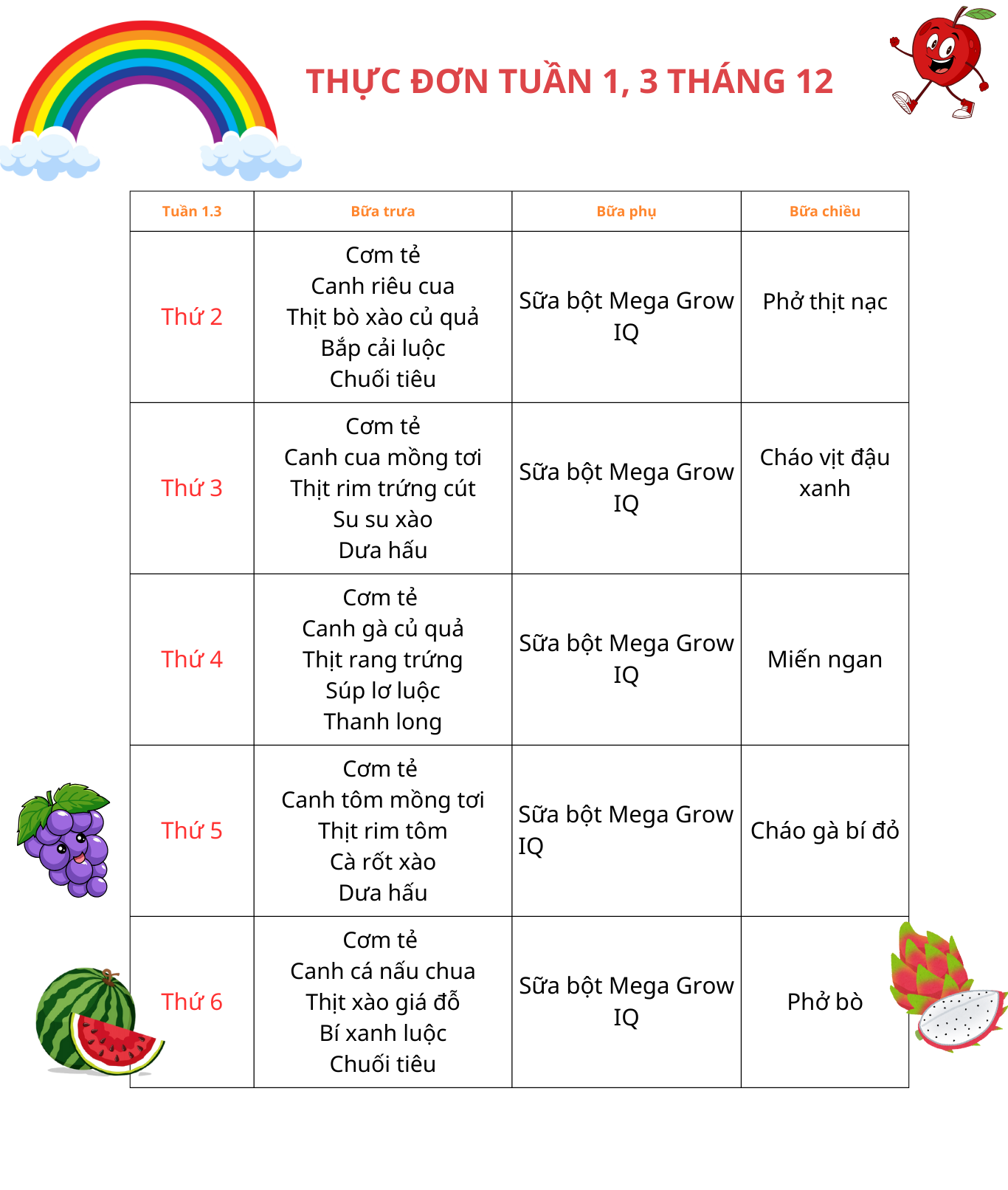 THỰC ĐƠN TUẦN 1, 3 THÁNG 12 NĂM 2025