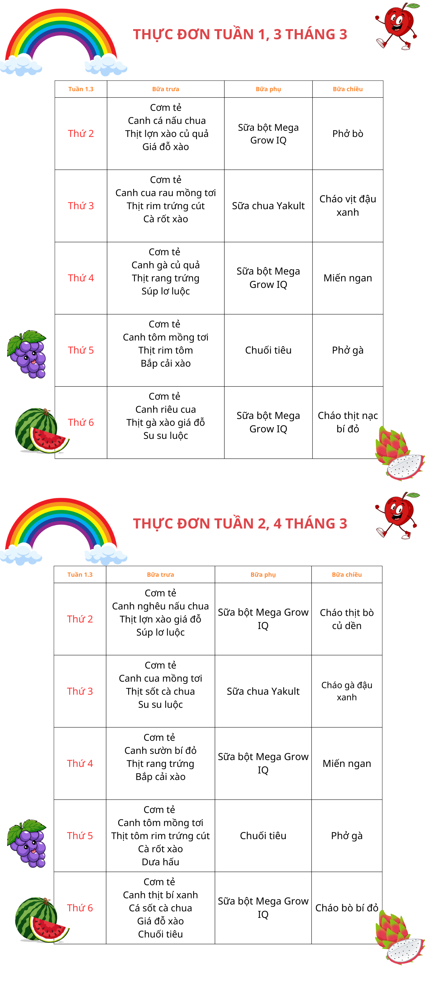Thực đơn tháng 3 năm 2026