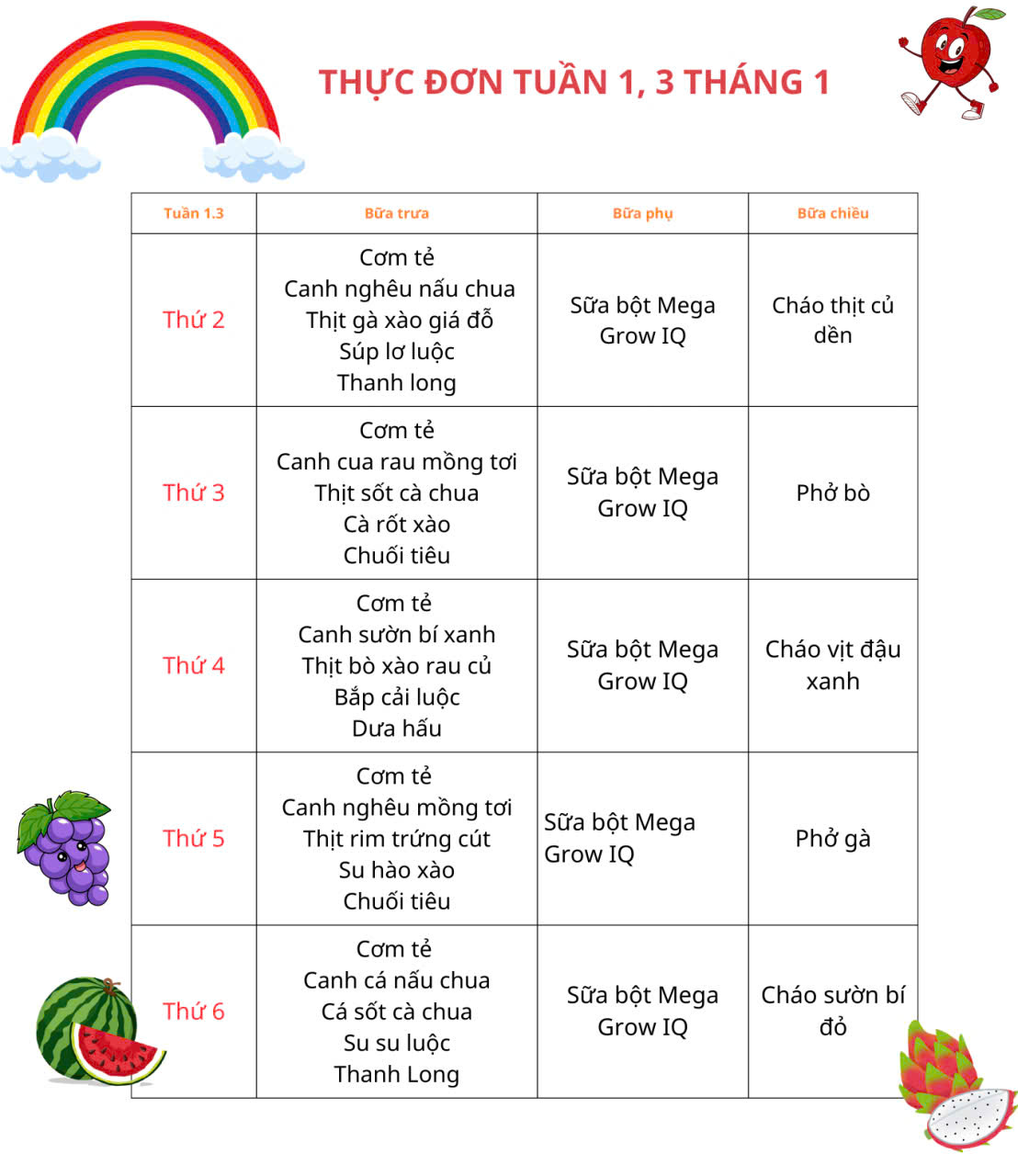 Thực đơn tuần 1 và tuần 3 tháng 01.2026