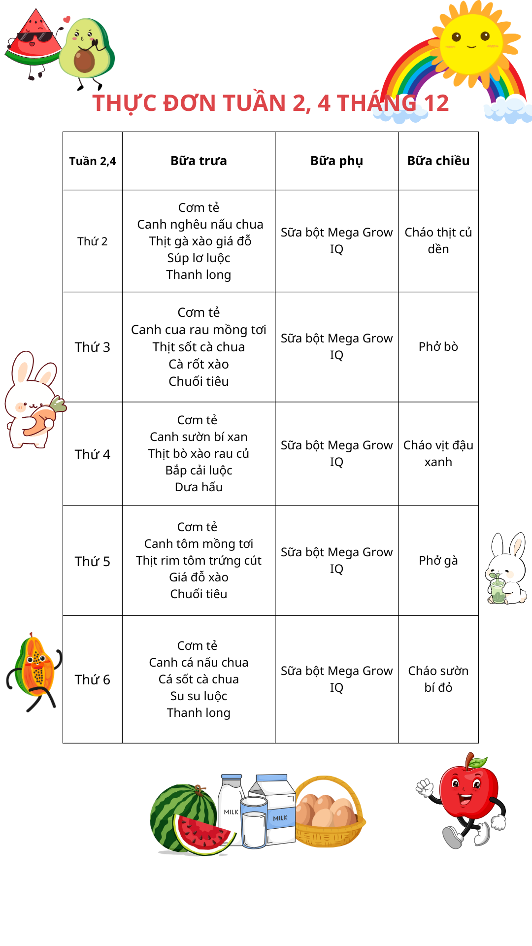 THỰC ĐƠN TUẦN 2, 4 THÁNG 12 NĂM 2025